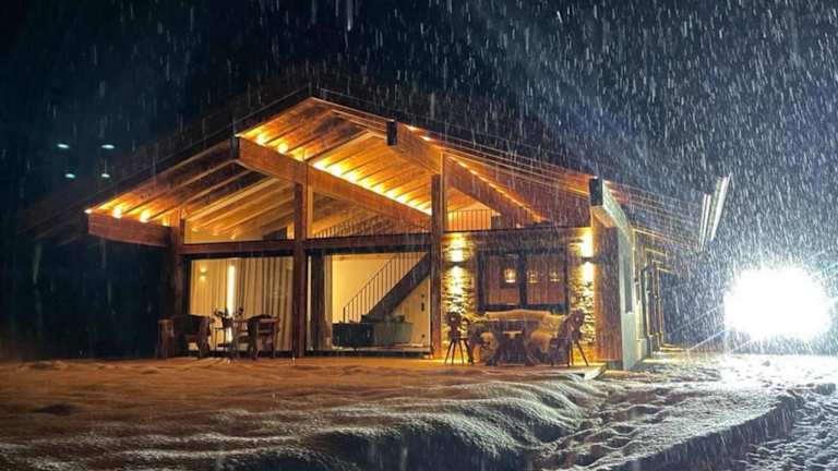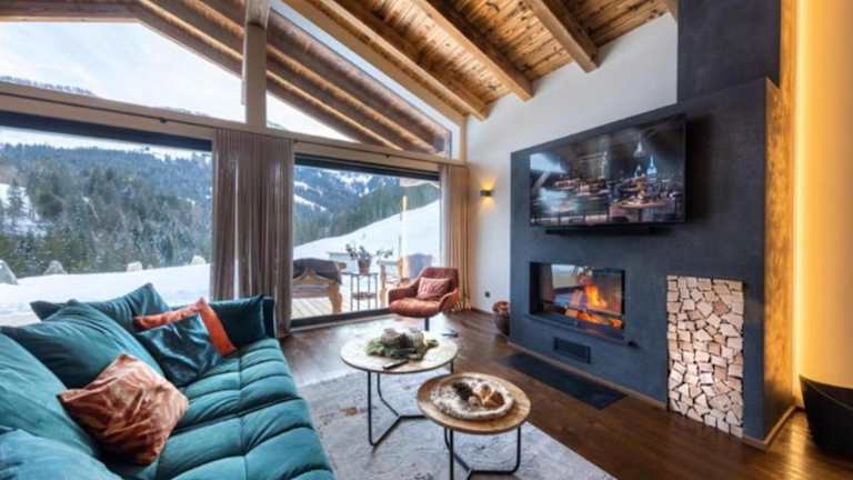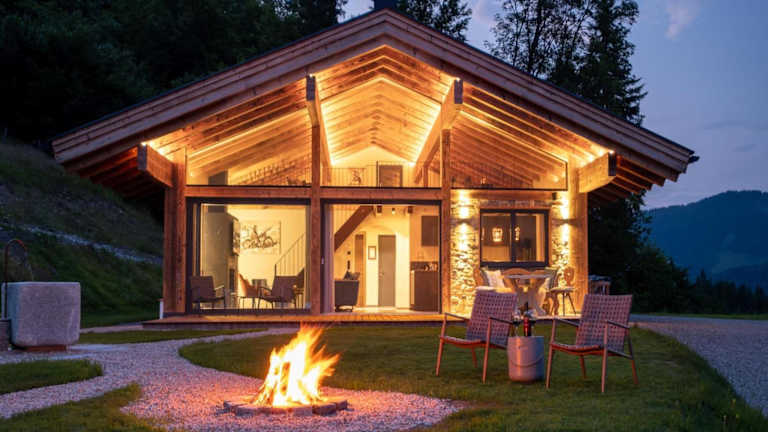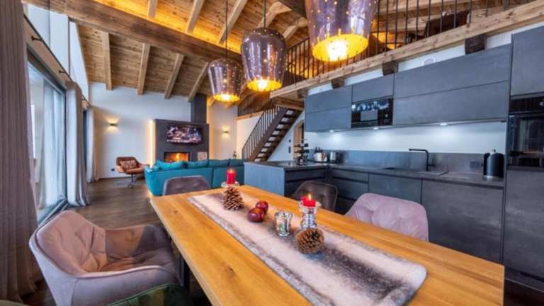 Das Chalet umfasst zwei Schlafzimmer, ein Wohnzimmer und eine gut ausgestattete Küche mit Kühlschrank und Geschirrspüler. Handtücher und Bettwäsche werden bereitgestellt.