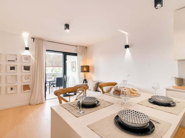 Die Ferienwohnung verfügt über ein Schlafzimmer sowie eine gut ausgestattete Küche mit Kühlschrank und Geschirrspüler. Zusätzlich gibt es ein Wohnzimmer und einen Flachbild-TV. Handtücher und Bettwäsche sind ebenfalls verfügbar.