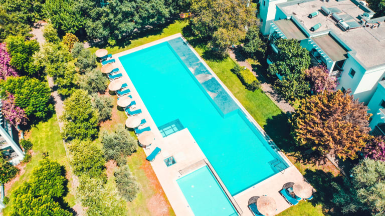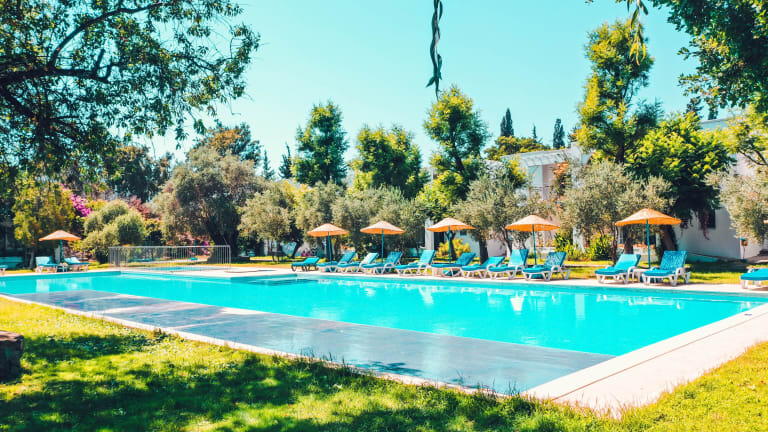 Das Sport- und Freizeitangebot umfasst eine Außenpoolanlage mit einem Kinderbereich, die für regelmäßiges Aquatraining und aktive Erholung genutzt werden kann. Liegestühle und Sonnenschirme stehen auf der Terrasse bereit.