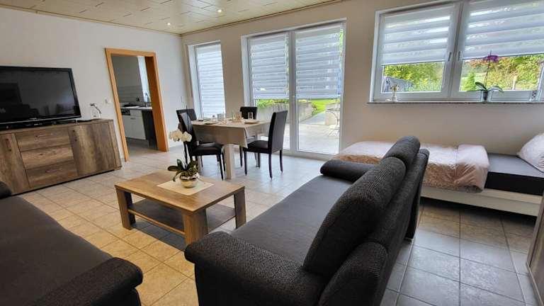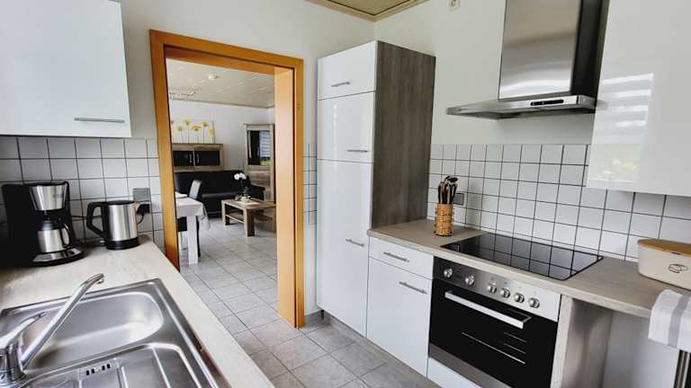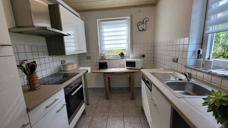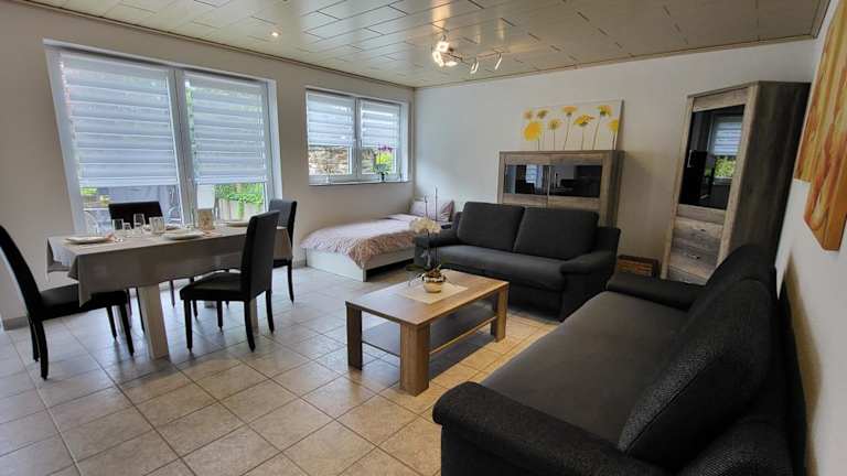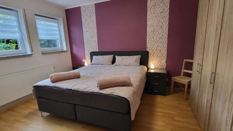 Die Ferienwohnung umfasst ein Schlafzimmer, ein Badezimmer mit Dusche und Badewanne sowie ein Wohnzimmer mit einem Sitzbereich und einem Essbereich. Zudem ist eine voll ausgestattete Küche mit Kühlschrank, Geschirrspüler und Ofen vorhanden. Handtücher und Bettwäsche werden bereitgestellt.
