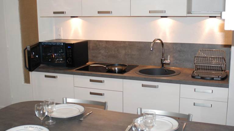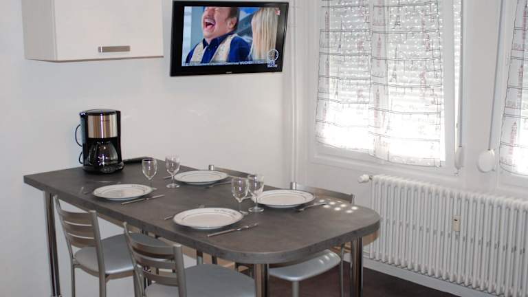 Die Ferienwohnung ist mit einer voll ausgestatteten Küche ausgestattet, die einen Kühlschrank und eine Kaffeemaschine beinhaltet, was die Zubereitung eigener Mahlzeiten ermöglicht.