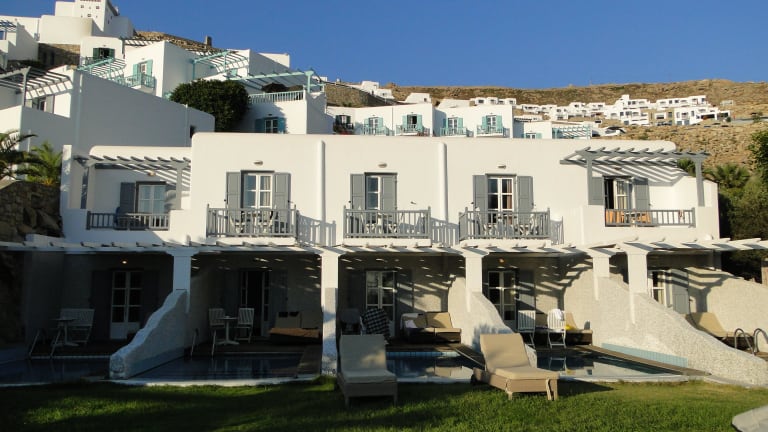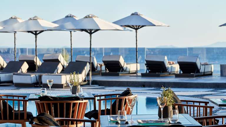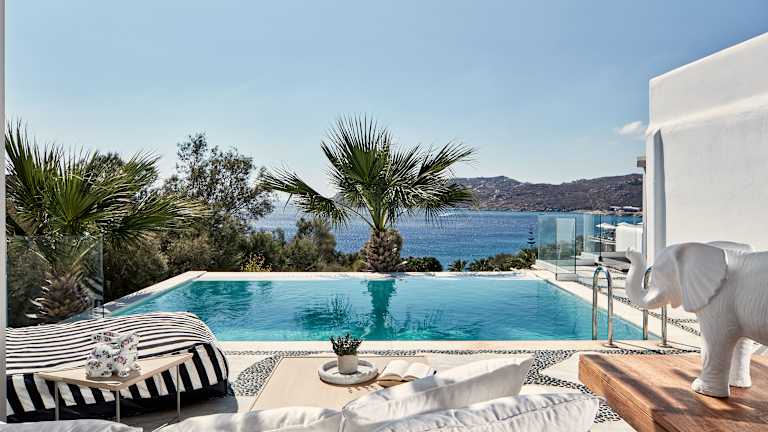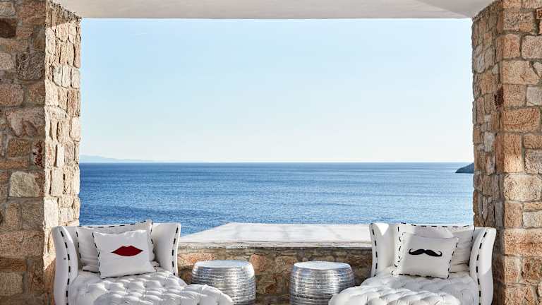 Das Hotel befindet sich oberhalb von Elia, dem längsten Strand der Insel Mykonos, bekannt für seine aquamarinfarbenen Gewässer und den feinen Sand. Es liegt an der Südküste, etwa 20 Minuten mit dem Hotelshuttle von Mykonos Stadt entfernt. Gäste können das legendenhafte Nachtleben in Cavo Paradiso oder Super Paradise in kurzer Zeit erreichen. Ein Shuttleservice bringt die Gäste fast stündlich zur Stadt und zurück, zudem sind Wassertaxis verfügbar.