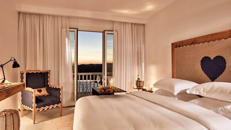 Die Zimmer im Myconian Imperial sind modern und komfortabel eingerichtet. Zur Ausstattung gehören Klimaanlage, Safe, Minibar, kostenloses WLAN, Fernseher mit Satellitenanschluss und Balkon mit Meer- oder Gartenblick. Einige Zimmer verfügen über einen Whirlpool oder einen eigenen Pool. Die Zimmergrößen variieren zwischen 28 und 55 m².