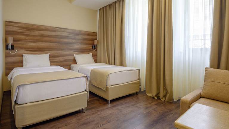 Die Zimmer sind mit Klimaanlage, Heizung, einem Queensizebett sowie einem Sofabett ausgestattet. Zustellbetten können angefragt werden. Zu den Annehmlichkeiten zählen ein Safe, eine Minibar, ein Flachbildfernseher, ein Telefon, Hausschuhe und kostenloses WLAN. Die Badezimmer sind mit einer Dusche, einem Haartrockner und Bademänteln ausgestattet und bieten Kosmetikartikel sowie eine Auswahl an Handtüchern. Das Hotel bietet Familienzimmer, Nichtraucher- und Raucherzimmer.