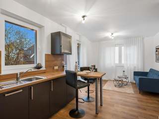 Die Ferienwohnung besitzt ein Schlafzimmer und eine voll ausgestattete Küche, die mit einem Ofen und einer Herdplatte eingerichtet ist. Das Badezimmer verfügt über eine Dusche und einen Haartrockner. Handtücher und Bettwäsche sind ebenfalls vorhanden.