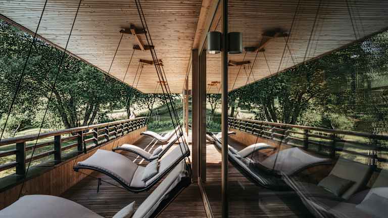 Finnische Sauna mit Panoramafenster Ein Raum aus Holz, Fichte und Tanne, zum schwitzen.Bei unserer finnischen Sauna, mit einer Lufttemperatur von 95 Grad Celsius und einer Luftfeuchtigkeit von 10%, werden Stoffwechsel und Kreislauf angeregt und die Durchblutung gefördert. Sie werden bei regelmäßiger Nutzung innerhalb kurzer Zeit die wohltuenden Eigenschaften einer Sauna zu schätzen wissen. Die Anzahl der Saunagänge liegt zwischen einmal pro Woche und einmal pro Monat. Im Saunabereich befinden sich Erlebnisduschen und ein Crushed Ice Spender zur Abkühlung. Ein Kneippbecken und ein Steintretbecken zur Fußmassage aktivieren Ihren Kreislauf. Entspannung finden Sie im großzügig gestalteten Ruheraum mit Sonnenbalkon, Schwebeliegen und einzigartigem Bergpanorama. Im Liegeraum vor dem Schwimmbad gibt es die einzigartige Möglichkeit, unter einem Farblicht-Flächengerät, - elektrosmogfrei und in höchster Reinheit die Farbbestrahlung zu genießen und dabei aufzutanken. Jede Zelle Ihres Körpers wird stimuliert. Laconium im Untergeschoß Sanfte Form der finnischen Sauna. Bei Temperaturen von 55 Grad und 25% Luftfeuchtigkeit wird der Körper langsam erwärmt und zum Abbau von Stoffwechselschlacken angeregt. Ideal gegen Stress, anregend für Herztätigkeit und Kreislauf. Biosauna im Untergeschoß Sie wird auch Niedrigtemperatursauna oder Sanarium genannt und ist sehr kreislaufschonend. Die Luftfeuchtigkeit liegt bei ca. 50% und die Temperatur beträgt im Schnitt 50°C. Da die Biosauna kreislaufschonend ist, ist die Verweildauer etwas höher, sie liegt zwischen 15 und 30 Minuten.