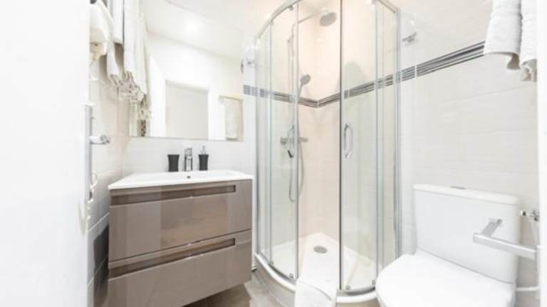 Die Ferienwohnung bietet ein Schlafzimmer und ein Badezimmer mit einer Dusche. Die gut ausgestattete Küche enthält einen Kühlschrank und eine Mikrowelle.