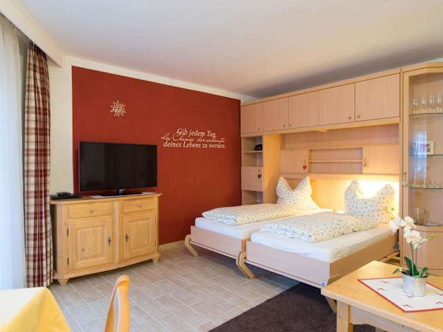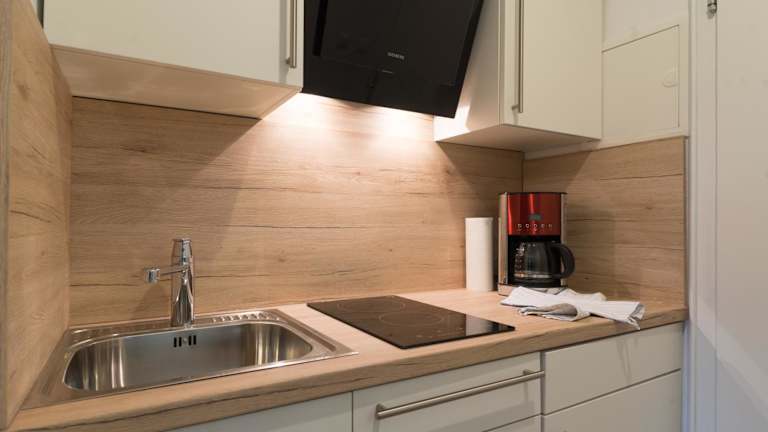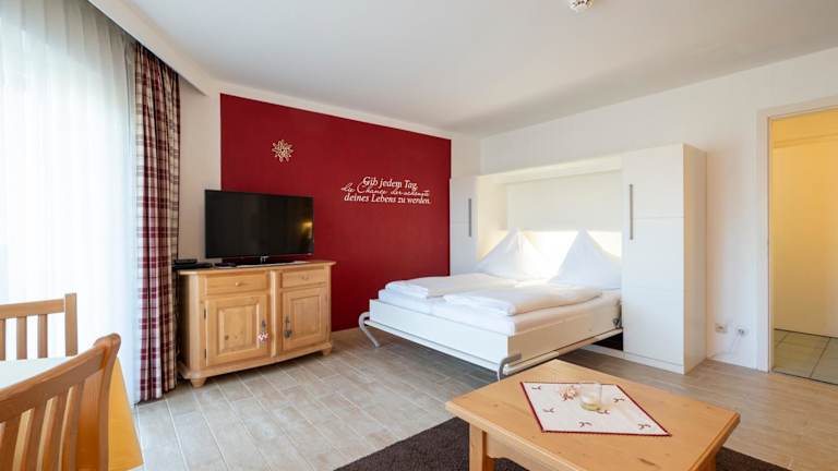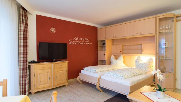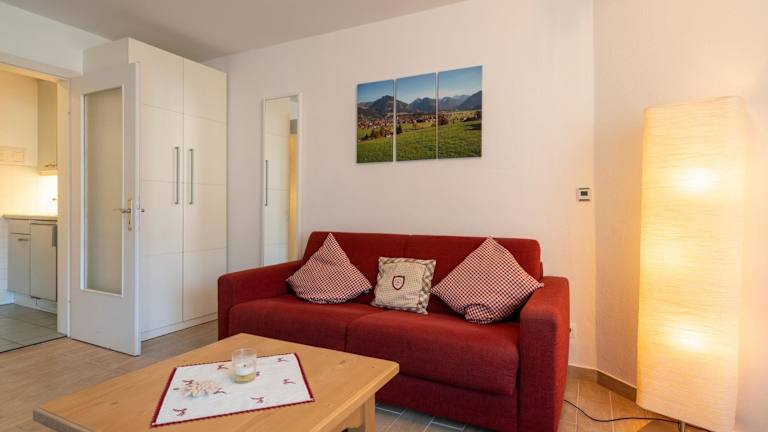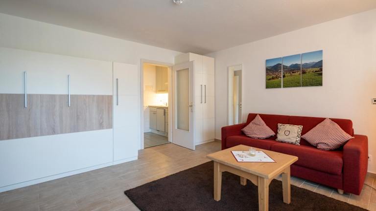 Jedes Apartment oder Studio im Nebelhorn Appartementhaus verfügt über einen eigenen Balkon, auf dem Sie die frische Bergluft und den Blick auf die umliegende Landschaft genießen können. Der kombinierte Wohn- und Schlafbereich ist gemütlich eingerichtet und verfügt über einen Kabel-TV. In der Küchenzeile finden Sie alles, was Sie zum Zubereiten einfacher Mahlzeiten benötigen, einschließlich eines kleinen Essbereichs, eines Herdes und eines Kühlschranks. Ein Flur mit einem Kleiderschrank und ein eigenes Badezimmer komplettieren die Ausstattung.
