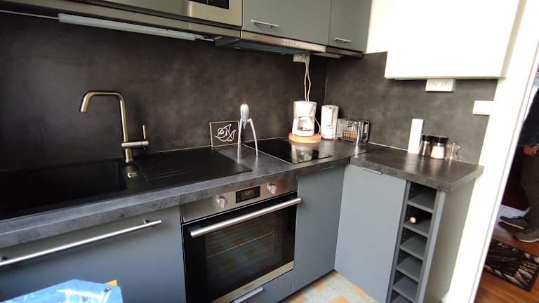 Die Ferienwohnung verfügt über eine voll ausgestattete Küche mit Kühlschrank und Kaffeemaschine, jedoch sind keine weiteren Informationen zu Verpflegungsmöglichkeiten vorhanden.