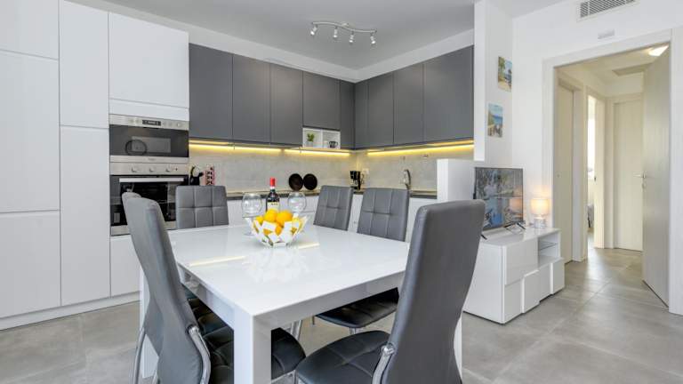 Die Ferienwohnung ist klimatisiert und verfügt über zwei Schlafzimmer, ein Wohnzimmer sowie eine komplett ausgestattete Küche mit Kühlschrank und Kaffeemaschine. Es gibt zwei Badezimmer, die mit einem Bidet und einer Dusche ausgestattet sind. Handtücher und Bettwäsche werden bereitgestellt.