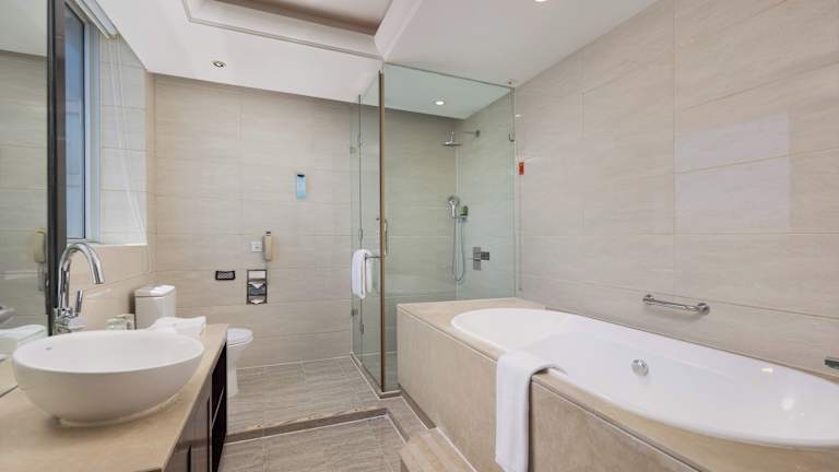 Die Zimmer sind mit Klimaanlage und Heizung ausgestattet und bieten teilweise einen schönen Meerblick. Sie verfügen über ein Doppelbett, ein Queensize-Bett, ein Kingsize-Bett oder ein Sofabett. Zur Standardausstattung zählen ein Safe, eine Minibar, ein Minikühlschrank sowie Tee- und Kaffeezubehör. Ein Telefon, ein TV-Gerät und kostenfreies WLAN sind vorhanden. Die Bäder sind mit Dusche und Badewanne ausgestattet und bieten Bademäntel sowie kostenlose Pflegeprodukte.