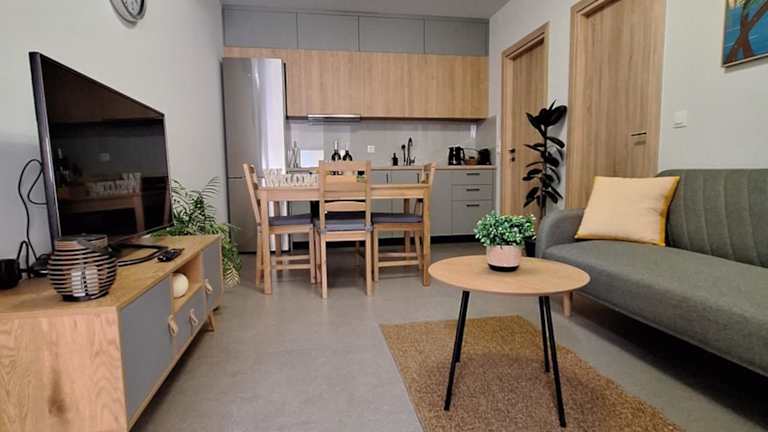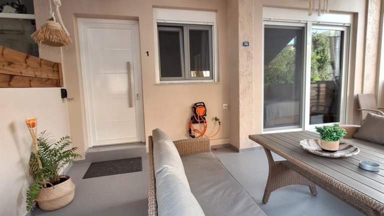 Die Ferienwohnung verfügt über ein Schlafzimmer, ein Wohnzimmer, eine voll ausgestattete Küche mit Kühlschrank und Kaffeemaschine sowie ein Badezimmer mit Bidet und Dusche. Handtücher und Bettwäsche werden bereitgestellt. Zudem gibt es eine Terrasse zur Nutzung.