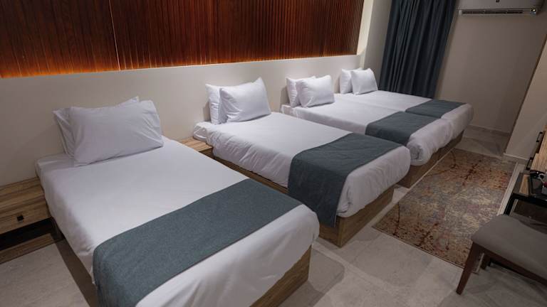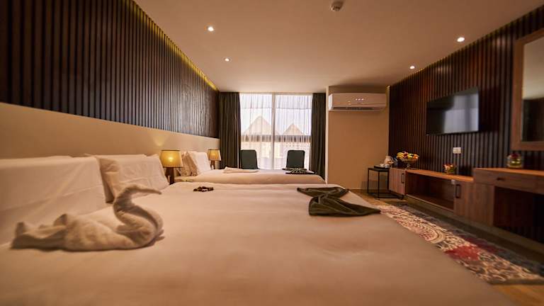 Jedes Zimmer im New Pyramid Front Hotel ist mit einem Kleiderschrank, Klimaanlage, Flachbild-TV und einem eigenen Badezimmer mit Dusche und Haartrockner ausgestattet. Einige Zimmer bieten einen Blick auf die Berge.