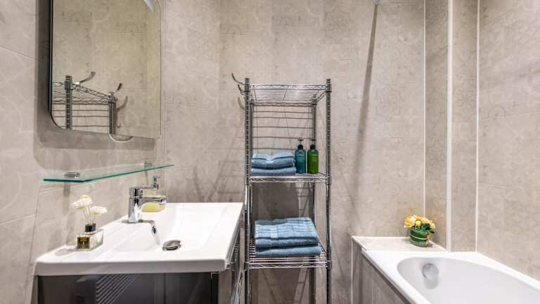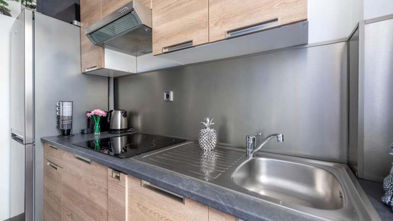 Die Wohnung umfasst ein Schlafzimmer, ein Wohnzimmer und eine voll ausgestattete Küche mit Kühlschrank und Kaffeemaschine. Das Badezimmer ist mit einer Badewanne und kostenlosen Pflegeprodukten ausgestattet. Handtücher und Bettwäsche werden bereitgestellt.