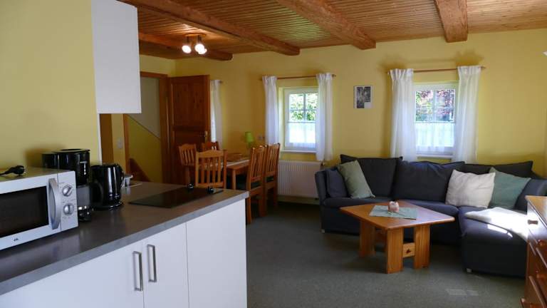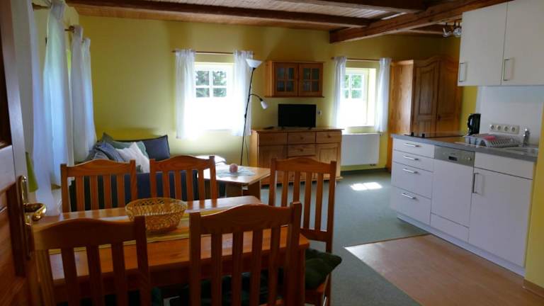 Die Ferienwohnung bietet eine voll ausgestattete Küche mit Kühlschrank, Geschirrspüler, Herdplatte, Toaster, Kaffeemaschine und Wasserkocher, was die Selbstverpflegung der Gäste ermöglicht. Ein Grill ist ebenfalls verfügbar.