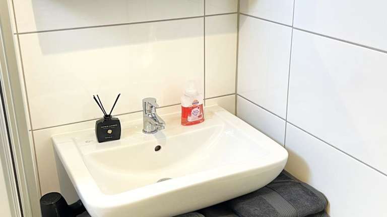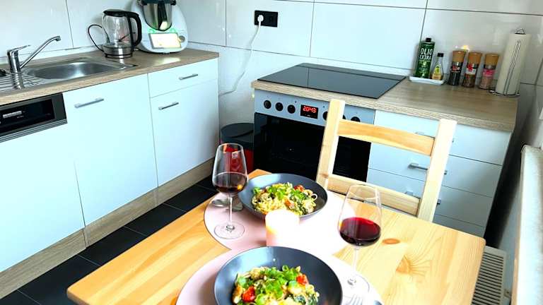Die Ferienwohnung verfügt über ein Schlafzimmer und eine voll ausgestattete Küche, die einen Kühlschrank und einen Geschirrspüler beinhaltet. Des Weiteren gibt es ein Badezimmer mit einer Dusche, Haartrockner und Waschmaschine. Handtücher und Bettwäsche werden bereitgestellt.