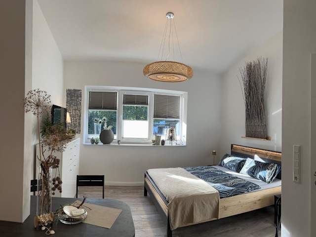 Die Ferienwohnung besteht aus einem Schlafzimmer, einem Wohnzimmer und einer voll ausgestatteten Küchenzeile, die einen Kühlschrank und eine Kaffeemaschine umfasst. Ein Badezimmer mit Dusche und Haartrockner ist ebenfalls vorhanden. Handtücher und Bettwäsche werden bereitgestellt.