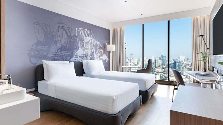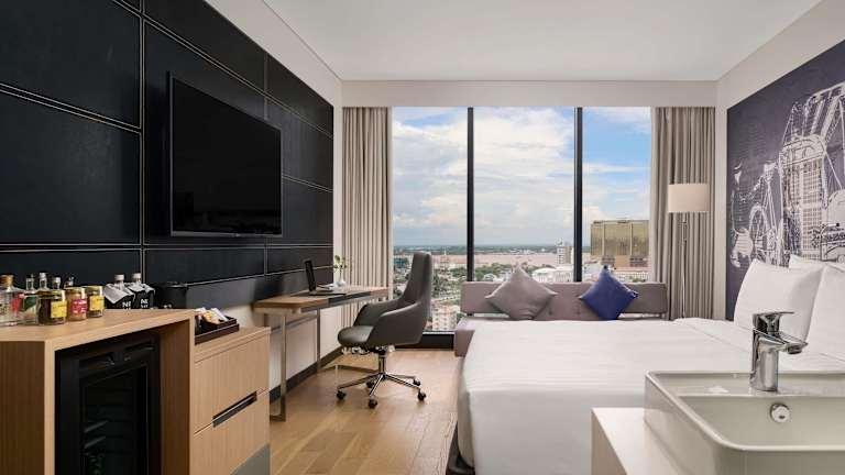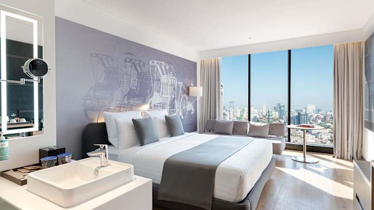 Die klimatisierten Zimmer sind mit einem Schreibtisch, einem Wasserkocher, einem Kühlschrank, einer Minibar, einem Safe, einem Flachbild-TV sowie einem eigenen Badezimmer mit einem Bidet ausgestattet. Bettwäsche und Handtücher sind in den Zimmern vorhanden.