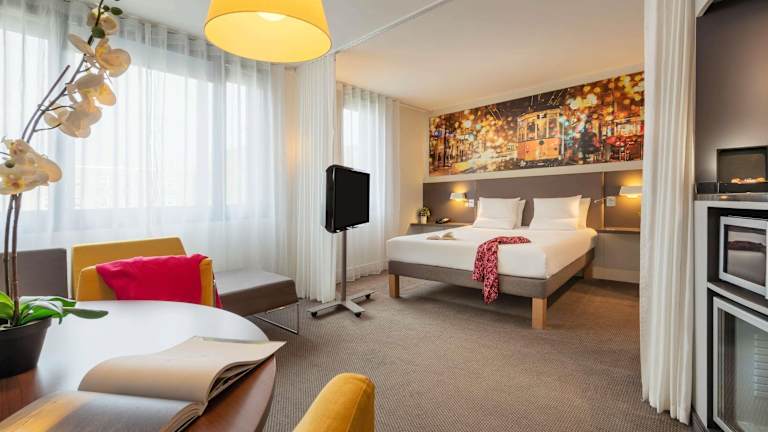 Das Novotel Suites Paris CDG Airport Villepinte ist die ideale Unterkunft für Reisende, die eine komfortable und praktische Unterkunft in der Nähe des Flughafens und des Messegeländes suchen. Die Suiten sind gut ausgestattet und bieten kostenloses WLAN. Genießen Sie das Frühstück, entspannen Sie in der Hotelbar und nutzen Sie den 24-Stunden-Fitnessraum. Der Shuttleservice und der Privatparkplatz bieten zusätzlichen Komfort.