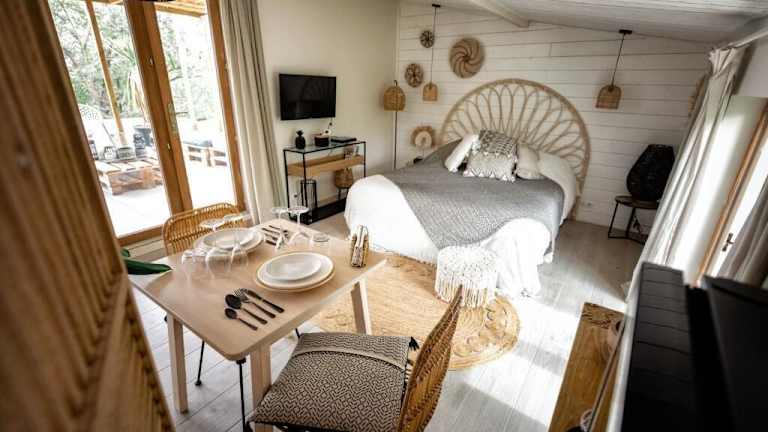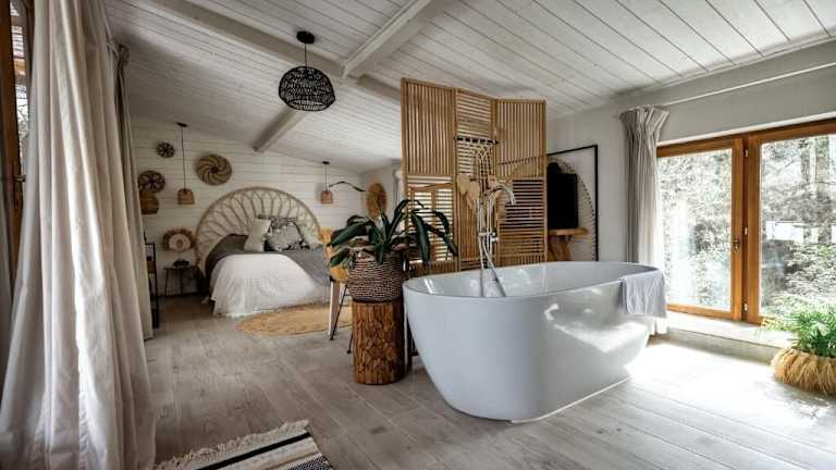 Die Unterkunft im Nuitées Bohèmes ist klimatisiert und verfügt über ein eigenes Bad mit einer Badewanne, kostenfreien Pflegeprodukten, einem Haartrockner und Hausschuhen. Das Highlight ist die Whirlpool-Badewanne, in der Sie sich nach einem langen Tag entspannen können. Genießen Sie den Blick auf den Garten von Ihrem Zimmer aus.