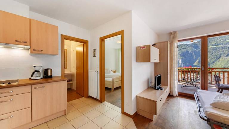 Die Ferienwohnung beinhaltet ein Schlafzimmer, ein Wohnzimmer mit Fernseher, eine gut ausgestattete Küche mit Kühlschrank und Geschirrspüler sowie ein Badezimmer mit Dusche. Zur Ausstattung gehören zudem eine Veranda/Patiobereich mit Blick auf die Berge. Handtücher und Bettwäsche werden gestellt.
