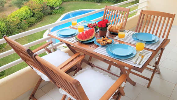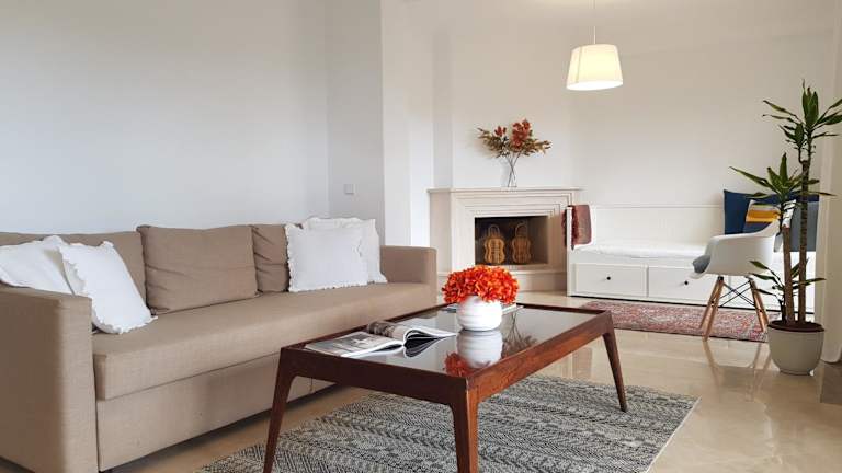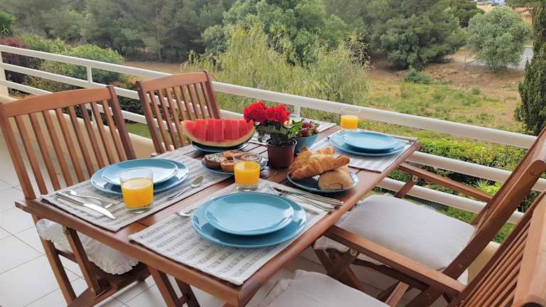 Die Ferienwohnung umfasst zwei Schlafzimmer, ein Wohnzimmer mit einem Satelliten-Flachbild-TV und eine gut ausgestattete Küche. Außerdem sind zwei Badezimmer vorhanden, die mit einem Bidet und einer Dusche ausgestattet sind. Eine Terrasse mit Meerblick und Gartenmöbel ergänzt die Ausstattung. Handtücher und Bettwäsche werden bereitgestellt.