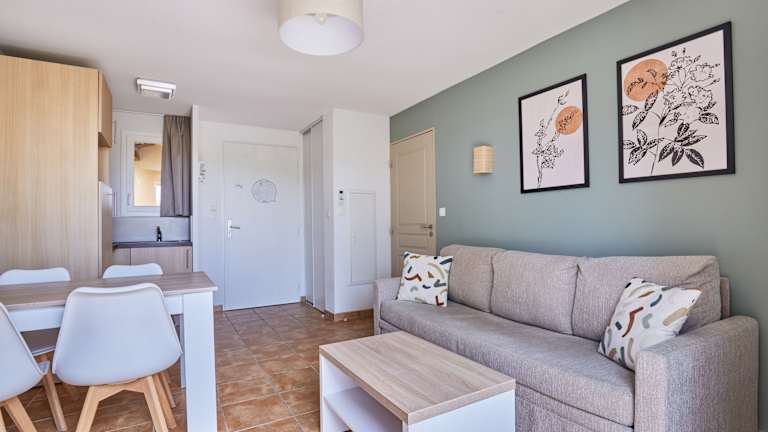Die Unterkünfte in der Résidence Odalys - Les Coteaux de Sarlat sind komfortabel eingerichtet und verfügen über eine Küchenzeile mit Kochplatten und einem Geschirrspüler. Jede Unterkunft hat ein eigenes Bad und einige bieten sogar Zugang zu einer kleinen Terrasse mit Blick auf den Garten. Hier können Sie entspannen und die ruhige Umgebung genießen.