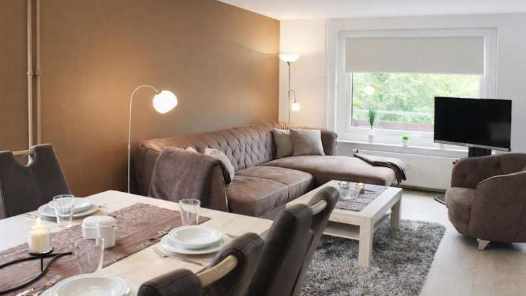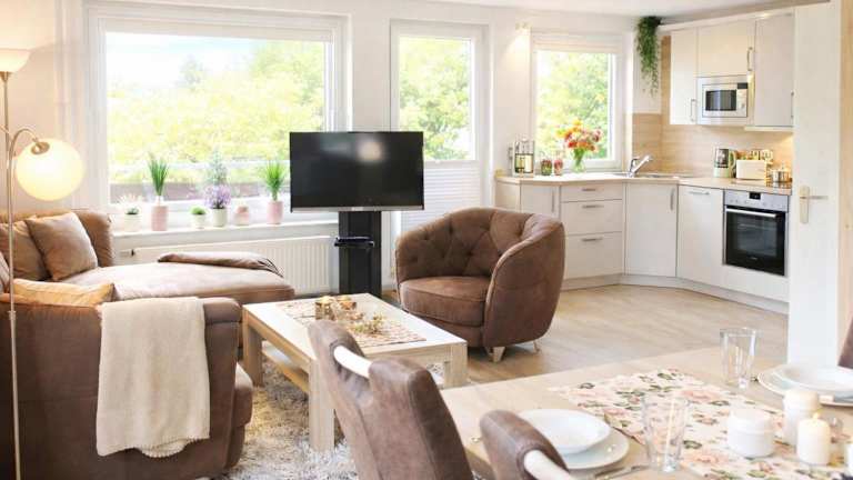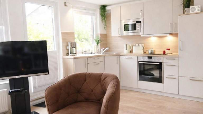 Die Ferienwohnung umfasst ein Schlafzimmer, ein Wohnzimmer und eine gut ausgestattete Küche, die mit einem Kühlschrank und einem Geschirrspüler ausgestattet ist. Zu den weiteren Ausstattungen gehören ein Balkon und ein TV. WLAN ist in allen Bereichen verfügbar.