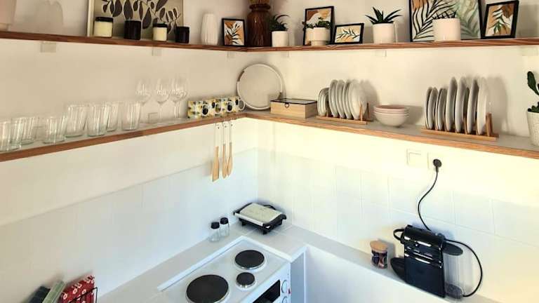 Die Ferienwohnung besteht aus einem Schlafzimmer und einem Wohnzimmer. Eine voll ausgestattete Küche ist vorhanden, die einen Kühlschrank und eine Kaffeemaschine umfasst. Das Badezimmer verfügt über eine Dusche und einen Haartrockner. Handtücher und Bettwäsche sind ebenfalls verfügbar.