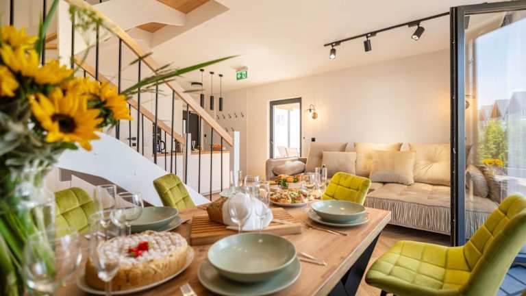 Die Ferienhäuser umfassen 3 Schlafzimmer, ein Wohnzimmer mit Flachbild-TV, eine voll ausgestattete Küche mit Kühlschrank und Geschirrspüler sowie 2 Badezimmer mit Dusche. Handtücher und Bettwäsche werden bereitgestellt.