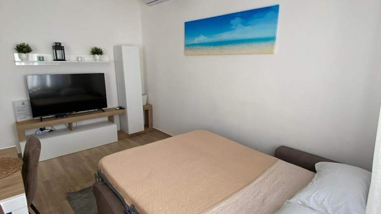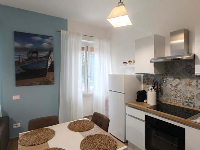 Die Unterkunft umfasst ein Schlafzimmer, ein Wohnzimmer, eine voll ausgestattete Küche mit Kühlschrank und Kaffeemaschine sowie ein Badezimmer mit Bidet und Dusche. Handtücher und Bettwäsche werden bereitgestellt.