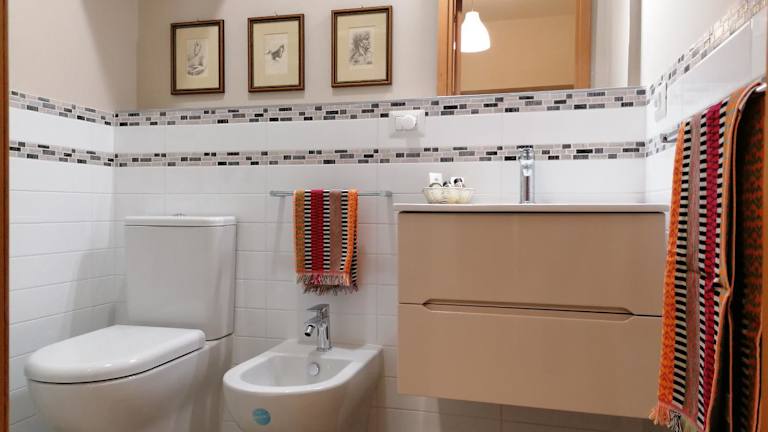 Die Ferienwohnung besteht aus einem Schlafzimmer, einem Wohnzimmer sowie einem Badezimmer mit Bidet. Zur Ausstattung gehören ein Flachbild-TV, eine gut ausgestattete Küche mit Kühlschrank und Ofen und ein Balkon mit Meerblick. Handtücher und Bettwäsche sind ebenfalls im Angebot enthalten.