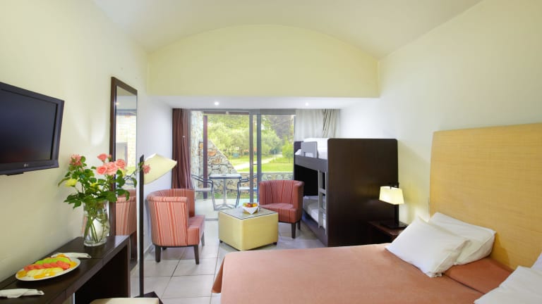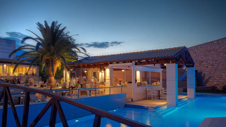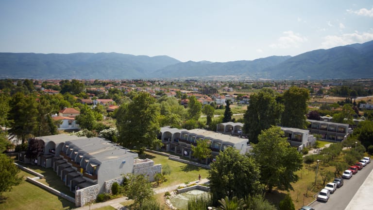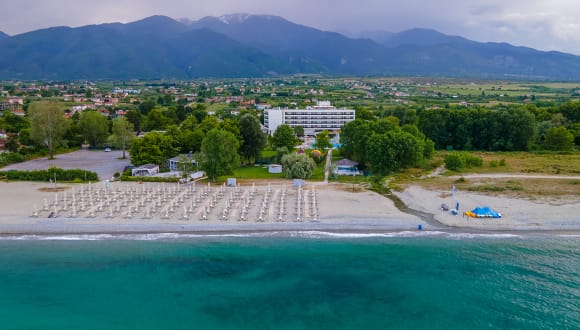 Vor dem Panorama des Berges Olymp und eingebettet in die herrliche Umgebung befindet sich der neu gestaltete Komplex "The Olympian Bay Bungalows". Die mit internationalem Clubcharakter gehörenden Bungalows liegen in den ersten beiden Bungalowreihen zum Meer, und bieten viel Ruhe und Erholung im üppig angelegten Gartenbereich (nur für Gäste ab 14 Jahren der Olympian Bay Bungalows vorgesehen), gleichzeitig können die umfangreichen Annehmlichkeiten des großen Ferienhotels mit genutzt werden. Eine ideale Kombination für Paare und Singles auf der Suche nach einer entspannten Unterkunft, ohne Verzicht auf das Angebot eines Club Hotels. Der lange Sand-/Kiesstrand von Leptokaria Pieria liegt direkt vor dem Hotel und lädt zu ausgedehnten Spaziergängen ein. In nur 10 Gehminuten erreichen Sie das Zentrum des Dorfes mit Einkaufsmöglichkeiten, Tavernen und Bars. Die Stadt Litochoro ist 8 km entfernt, den Flughafen erreichen Sie nach etwa 120 km.
