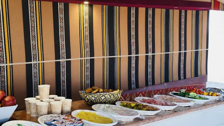 Im Wadi Rum Golden Sands Camp wird ein Frühstück in Buffetform angeboten, das vegetarische und halal-zubereitete Optionen umfasst. Die Unterkunft bietet zudem spezielle Mahlzeiten für bestimmte Ernährungsbedürfnisse auf Anfrage.