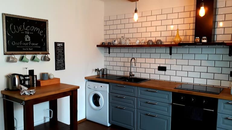 Das Onefourfour Apartment bietet eine komfortable Unterkunft mit einem Flachbild-TV und einem gemütlichen Sitzbereich zum Entspannen. Die voll ausgestattete Küche ermöglicht es Ihnen, Ihre eigenen Mahlzeiten zuzubereiten. Das Badezimmer verfügt über eine Dusche, ein WC und eine Waschmaschine. Kostenloses WLAN ist im gesamten Apartment verfügbar.