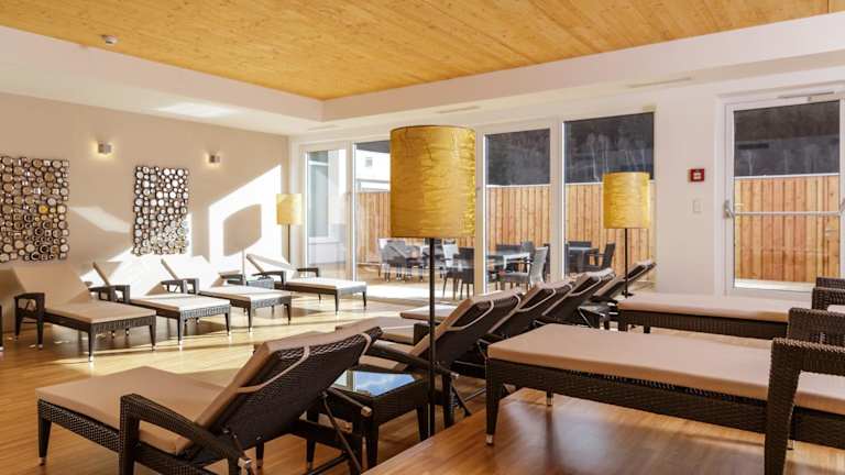 Im Freizeitbereich stehen verschiedene Aktivitäten zur Verfügung, darunter Wandermöglichkeiten sowie ein Innenpool, der ganzjährig geöffnet ist. Die Wellnesslounge und der Ruhebereich bieten Entspannung.