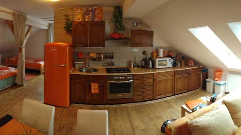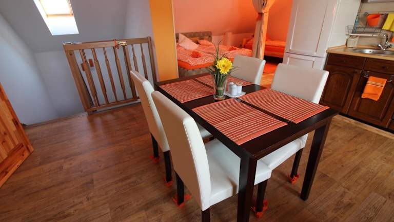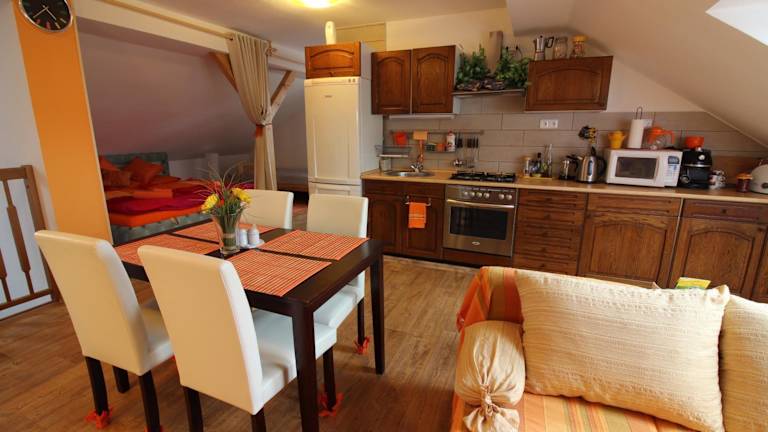 Das Orange Loft Apartment verfügt über eine voll ausgestattete Küche, in der Sie Ihre eigenen Mahlzeiten zubereiten können. Es gibt auch die Möglichkeit, einen Grill und eine Pergola auf Anfrage zu nutzen. Alternativ können Sie Český Krumlov besuchen, wo es eine Vielzahl von Restaurants und Cafés gibt, in denen Sie lokale Spezialitäten und internationale Küche genießen können.