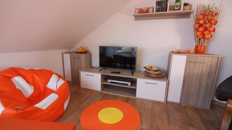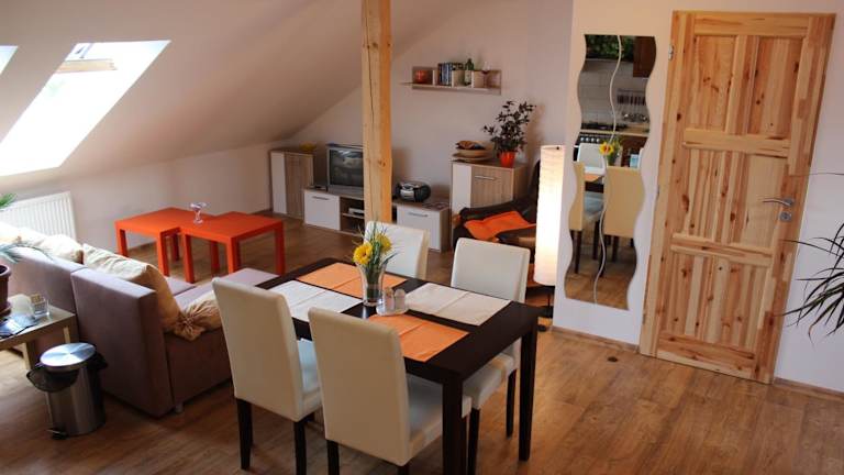 Das Orange Loft Apartment befindet sich in einer ruhigen Lage, etwa 6 km von Český Krumlov entfernt. Die Umgebung ist malerisch und bietet eine schöne Landschaft zum Erkunden. Český Krumlov selbst ist ein charmantes Städtchen mit einem historischen Schloss und einer Vielzahl von Sehenswürdigkeiten. Der Schlossgarten und der Stausee Lipno sind ebenfalls einen Besuch wert und bieten Outdoor-Aktivitäten und Entspannungsmöglichkeiten.