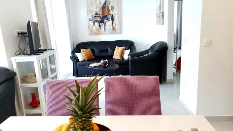 Die Ferienwohnung umfasst zwei Schlafzimmer und ein Badezimmer. Zur Ausstattung gehören Bettwäsche, Handtücher, ein Flachbild-TV, ein Essbereich sowie eine voll ausgestattete Küche. Der Balkon ermöglicht einen schönen Ausblick auf das Meer.