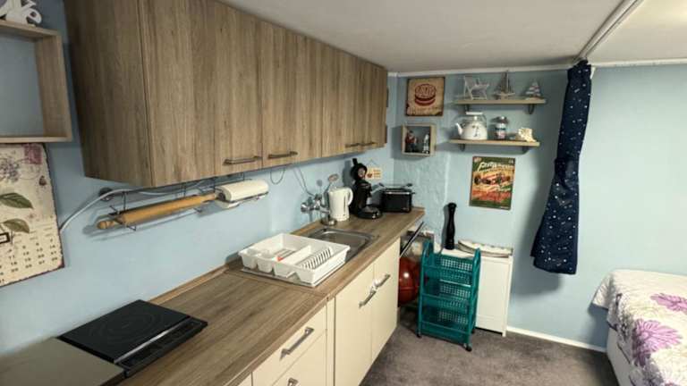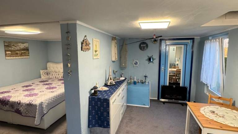 Die Ferienwohnung verfügt über ein Schlafzimmer, eine Küchenzeile mit Kühlschrank und Herdplatte sowie ein Badezimmer mit Dusche, Haartrockner und Waschmaschine. Handtücher und Bettwäsche werden bereitgestellt. Die Ausstattung ermöglicht einen angenehmen Aufenthalt mit allem Notwendigen.