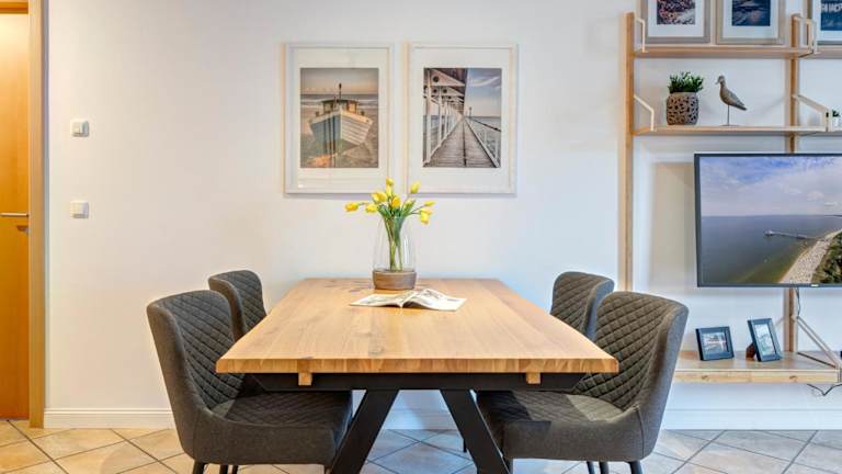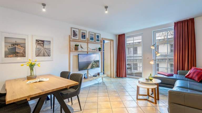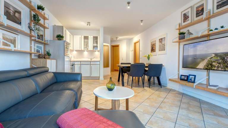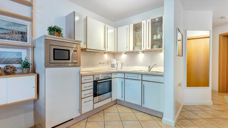 Die Ferienwohnung besteht aus zwei Schlafzimmern und einem Badezimmer und ist mit Bettwäsche, Handtüchern, einem TV sowie einer voll ausgestatteten Küche ausgestattet. Der Balkon bietet einen Blick auf das Meer, was den Aufenthalt zusätzlich angenehm gestaltet.