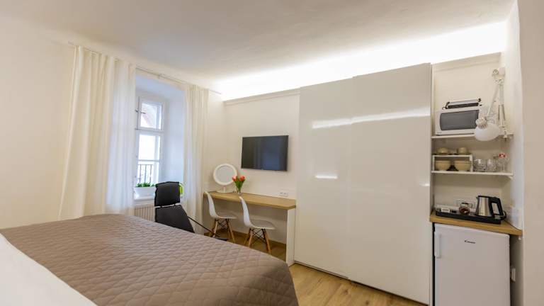 Die Palác Daun - Studio Apartments bieten komfortable Unterkünfte mit moderner Ausstattung. Die Apartments verfügen über eine Terrasse mit Stadtblick, einen gemütlichen Sitzbereich und einen Flachbild-Kabel-TV. Die voll ausgestattete Küchenzeile mit Kühlschrank, Backofen, Mikrowelle, Minibar, Toaster und Wasserkocher bietet alle Annehmlichkeiten, um Ihre eigenen Mahlzeiten zuzubereiten. Das private Badezimmer ist mit einer Dusche und kostenlosen Pflegeprodukten ausgestattet.