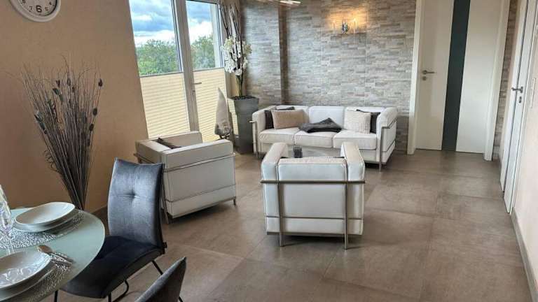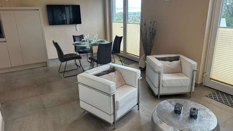 Palais -MehrGehtNicht-Maisonette bietet eine moderne Unterkunft mit kostenloser Internetverbindung und privaten Parkmöglichkeiten. Die Gäste können eine Terrasse mit Stadtblick nutzen und sich in einem Sitzbereich entspannen.