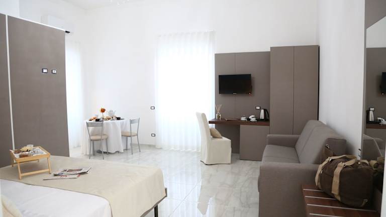 Die klimatisierten Zimmer im Palazzo Caracciolo del Sole sind geschmackvoll eingerichtet und bieten Annehmlichkeiten wie einen Balkon, einen Flachbild-TV und ein eigenes Bad mit kostenlosen Pflegeprodukten. Eine Minibar und ein Wasserkocher sind ebenfalls vorhanden. Genießen Sie den Komfort und die Gemütlichkeit dieser Unterkunft während Ihres Aufenthalts.