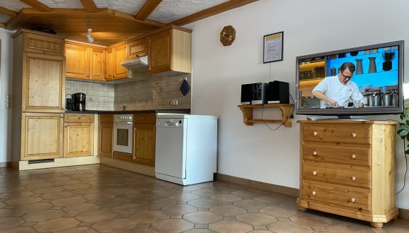 Unsere 4-Sterne Ferienwohnungen haben eine große und geräumige Wohnküche, Schlafzimmer und Bad. Jede Wohnung hat einen herrlichen Panaramablick zu den Ammergauer und Allgäuer Alpen.