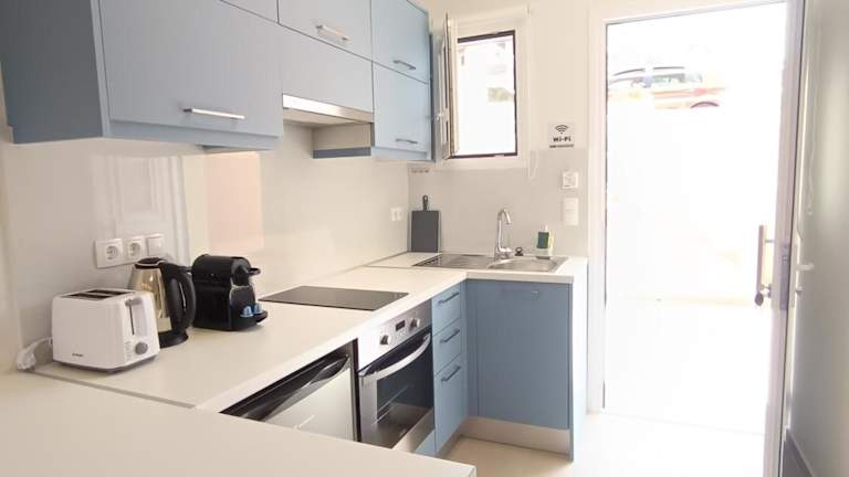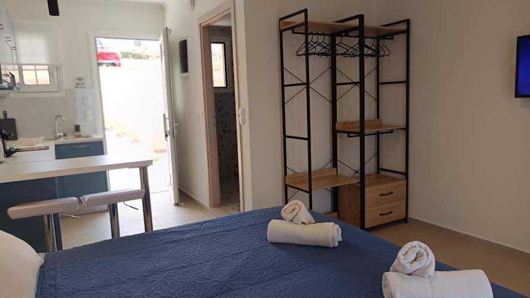In der Unterkunft stehen Kochmöglichkeiten zur Verfügung. Im nahegelegenen Dorf Agios Stefanos finden sich kleine Supermärkte für die Besorgung von Lebensmitteln und anderen Produkten des täglichen Bedarfs.