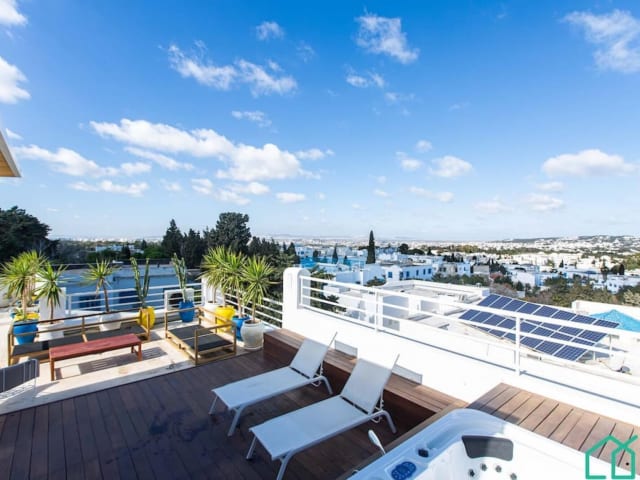 Genießen Sie einen unvergesslichen Aufenthalt im Panoramic View Enjoy a Jacuzzi in Sidi Bou Said. Das Apartment bietet kostenfreies WLAN, eine Terrasse und eine ideale Lage in der Nähe von Stränden und Sehenswürdigkeiten. Nutzen Sie die voll ausgestattete Küche, das klimatisierte Schlafzimmer und das moderne Badezimmer. Entdecken Sie die Schönheit von Sidi Bou Said und besuchen Sie beliebte Orte wie den Palast Baron d'Erlanger, den Hafen und den Park. Der Flughafen Tunis-Carthage ist ebenfalls leicht zu erreichen.