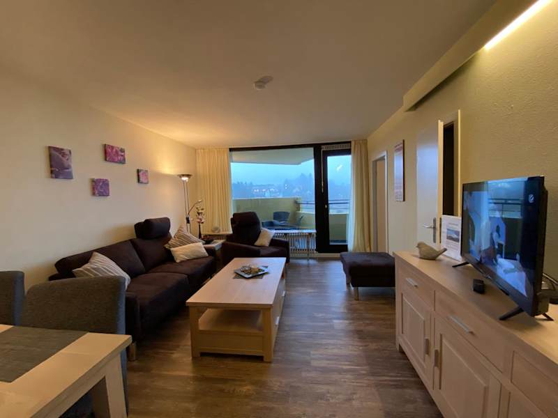 Die Ferienwohnung verfügt über zwei Schlafzimmer, ein Wohnzimmer und ein Badezimmer mit Dusche. Zur Ausstattung gehört ein Flachbild-TV sowie eine gut ausgestattete Küchenzeile mit Kühlschrank und Geschirrspüler. Ein Balkon mit Bergblick ist ebenfalls vorhanden. Handtücher und Bettwäsche sind gegen Aufpreis erhältlich. Allergikerfreundliche Zimmer sind vorhanden.