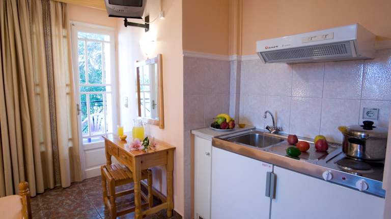 In unmittelbarer Nähe des Hotels, nur etwa 20 m entfernt, befinden sich ein Restaurant, eine Fischtaverne, eine Bäckerei und ein Café, die den Gästen verschiedene Verpflegungsmöglichkeiten bieten.