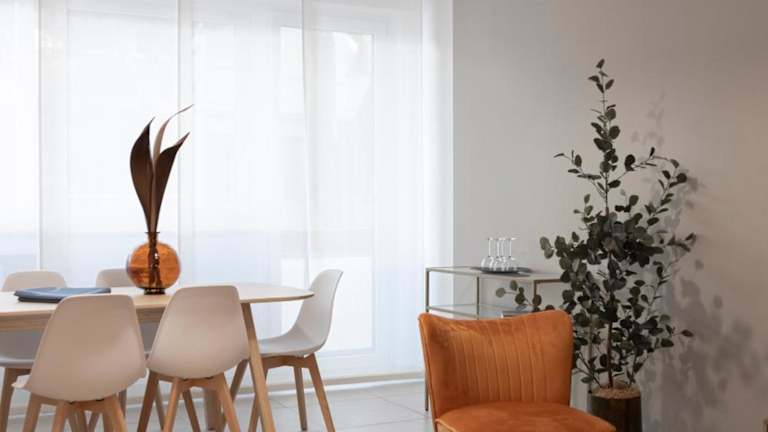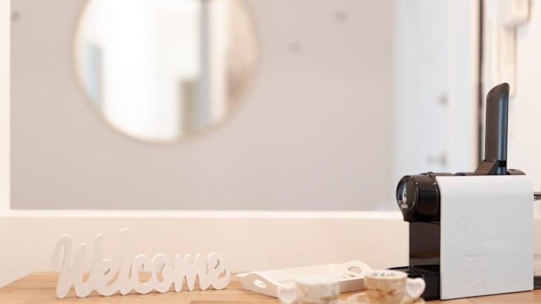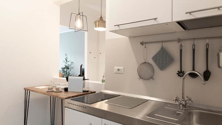 Die Ferienwohnung ist mit einer voll ausgestatteten Küche ausgestattet, die einen Kühlschrank und eine Kaffeemaschine umfasst. Es sind keine weiteren Verpflegungsmöglichkeiten angegeben.